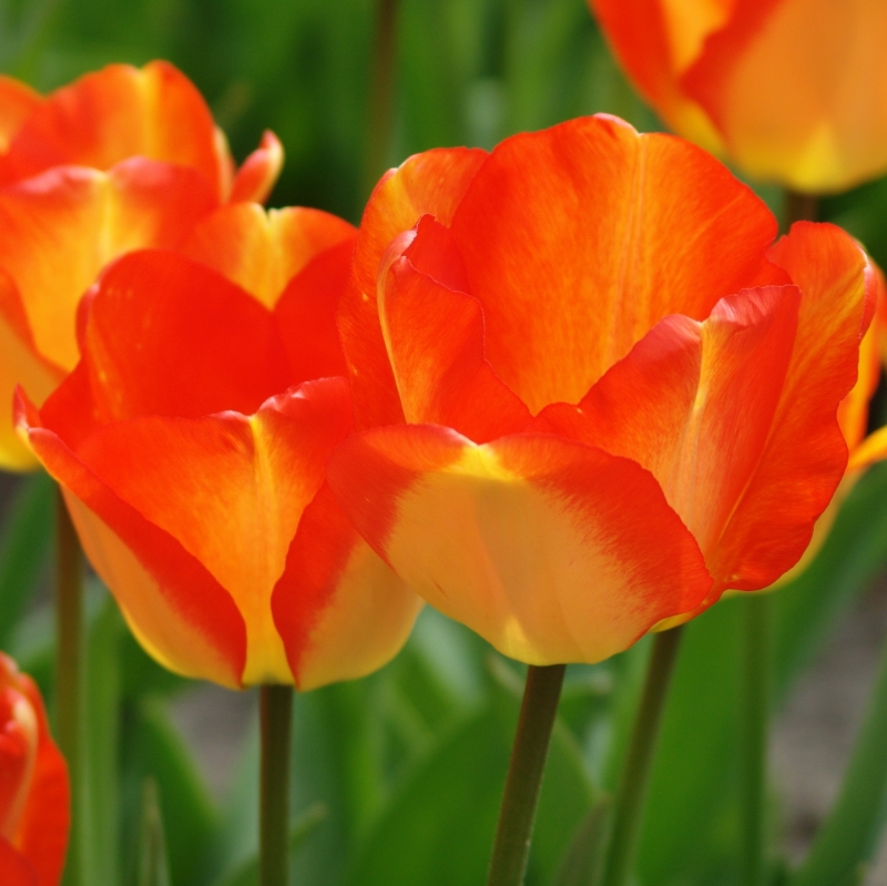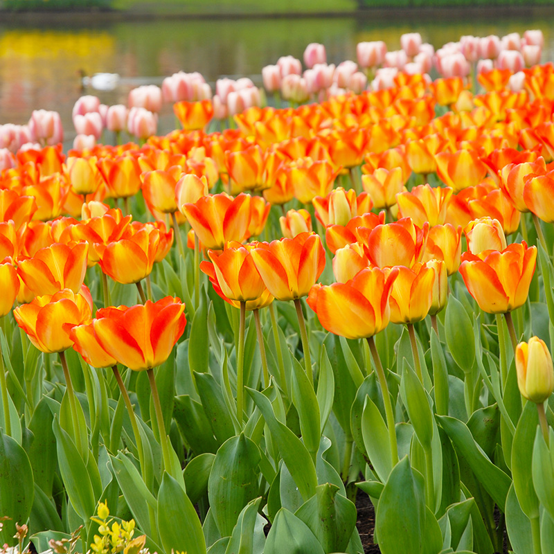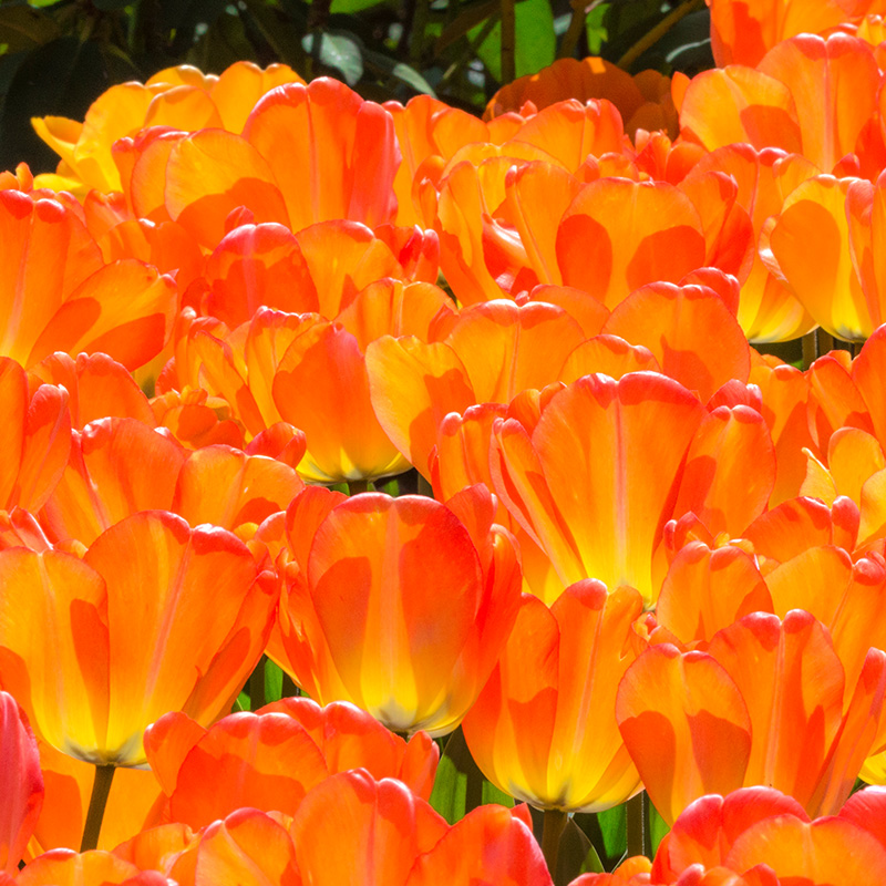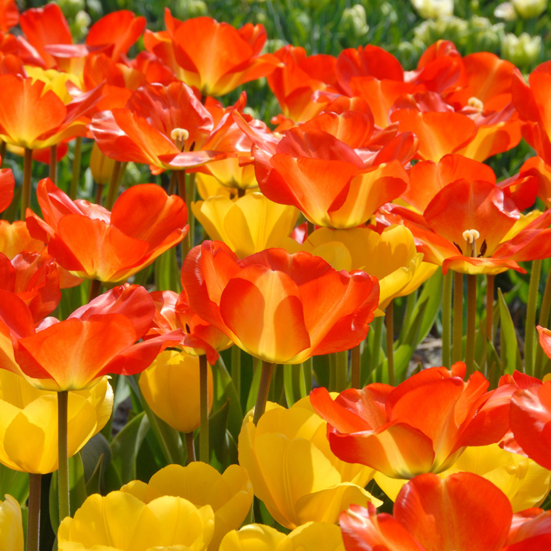 Tulip American Dream is a darwin-hybrid type tulip and grows very colourful flowers in orange, yellow and red. They look especially stunning in direct sunlight! For a fun effect, plant them in small groups. Darwin-hybrid tulips are single flowers and often available in various tints of yellow, pink, red and orange. They are well-known for their long blooming periods and sturdy stems. They are ideal to be planted in groups and their long stems make them perfect cut-flowers. When planted deep enough into the ground (around 15 cm deep) they will grow back in the following years to come.